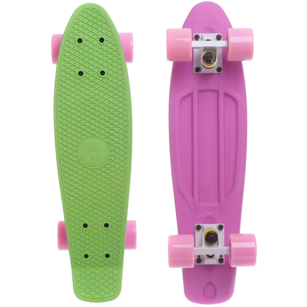 Яркая серия пенни бордов Fish Skateboards Green/Pink 22.5" - Салатовый/Розовый - в розовых и салатовых цветах отличный вариант для тех, кто любит кататься в любую погоду. Ему не страшны никакой ветер и дождь. Полиуретановые колеса средней жесткости обладают идеальным скольжением, что позволяет забыть о постоянном толкании доски.