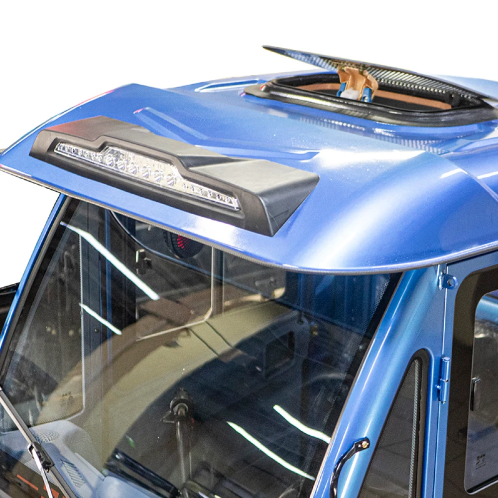 Усиленная конструкция рамы, барабанный тормоз и светодиодная передняя фара гарантируют безопасное вождение в любых условиях. Крытая герметичная кабина с открывающимися с двух сторон дверями обеспечивает защиту от непогоды, а механизм стеклоочистителя поддерживает чистоту лобового стекла.